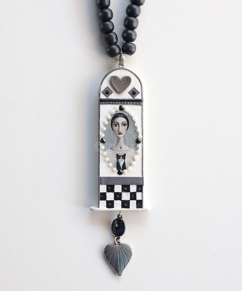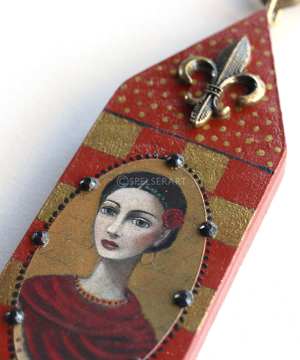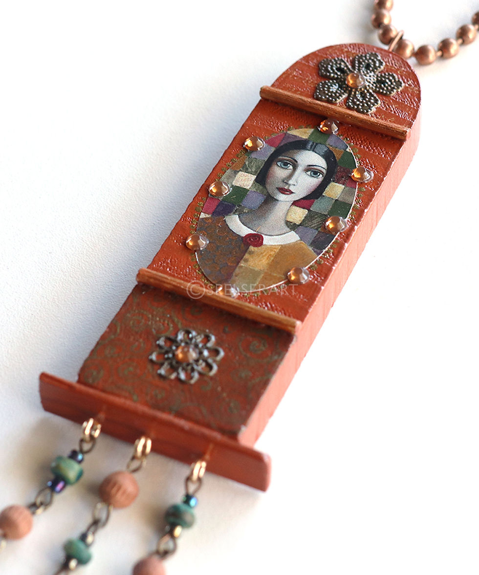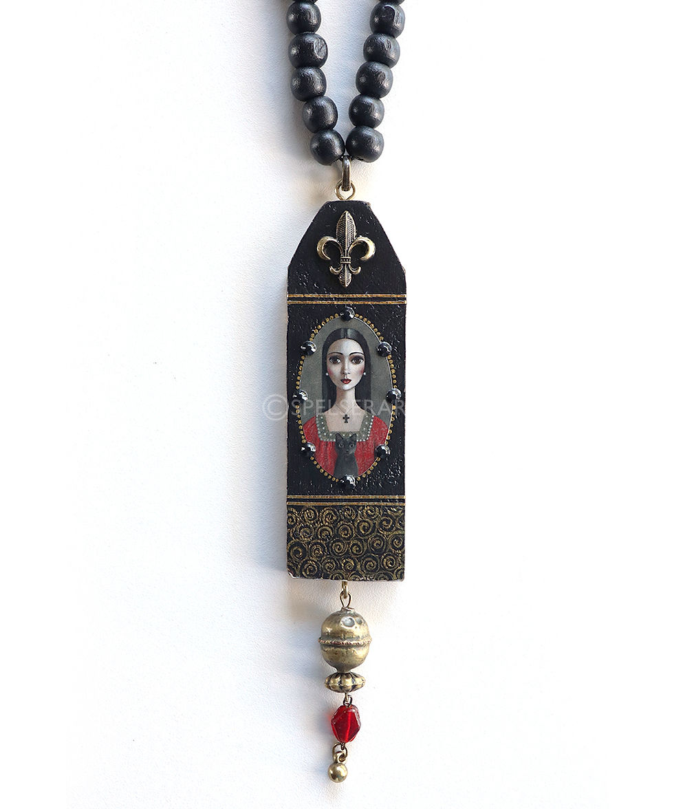 Discover our unique, handmade charms. They have a wooden base and contain a small printed image of one of Sandra’s ladies. The charms measure ± 110 x 35 x 10mm, and have varying chain lengths. They can be worn around the neck, hung on the wall or draped over a bodice or vanity.
