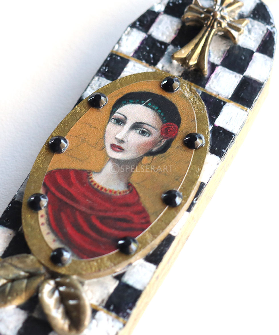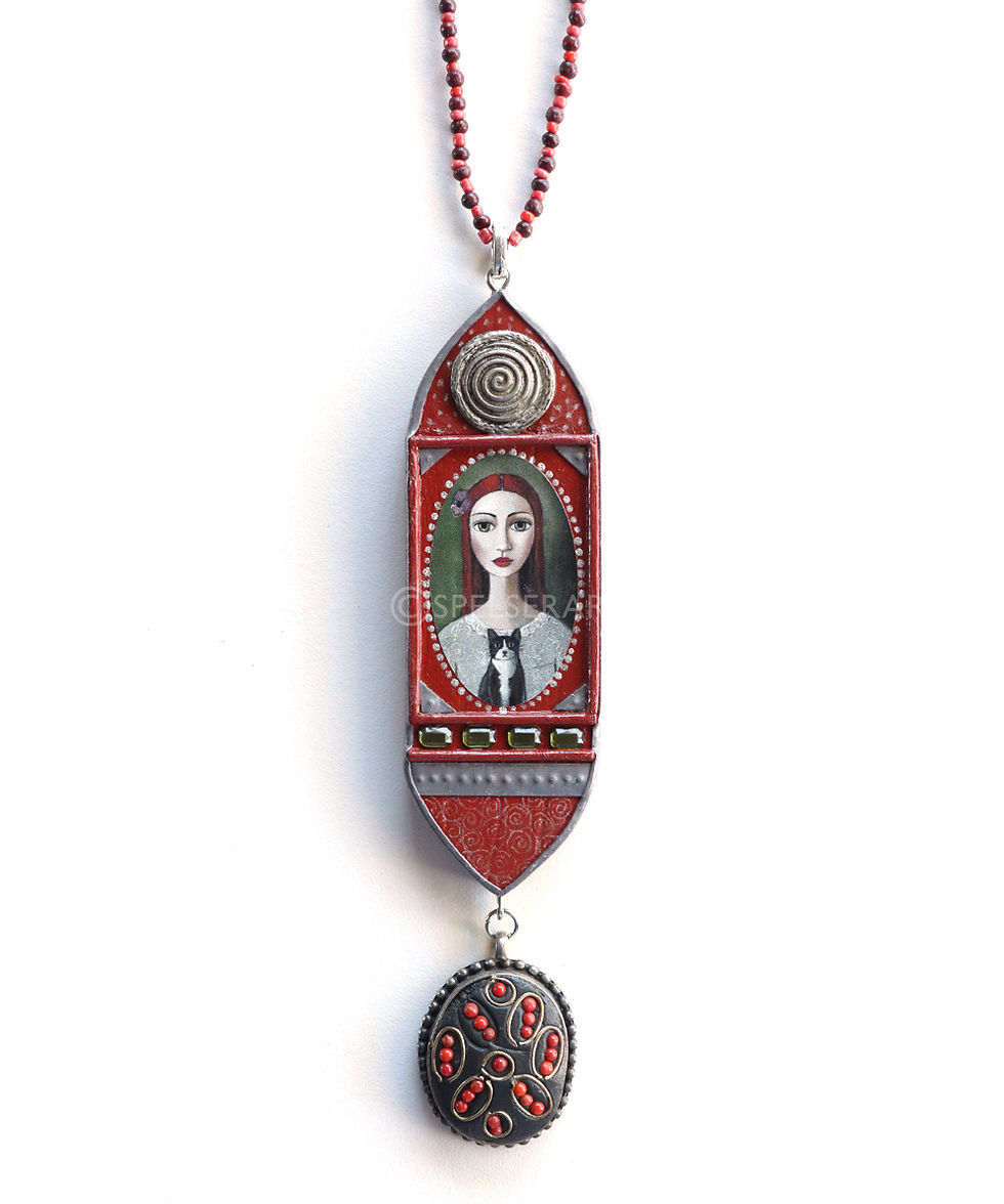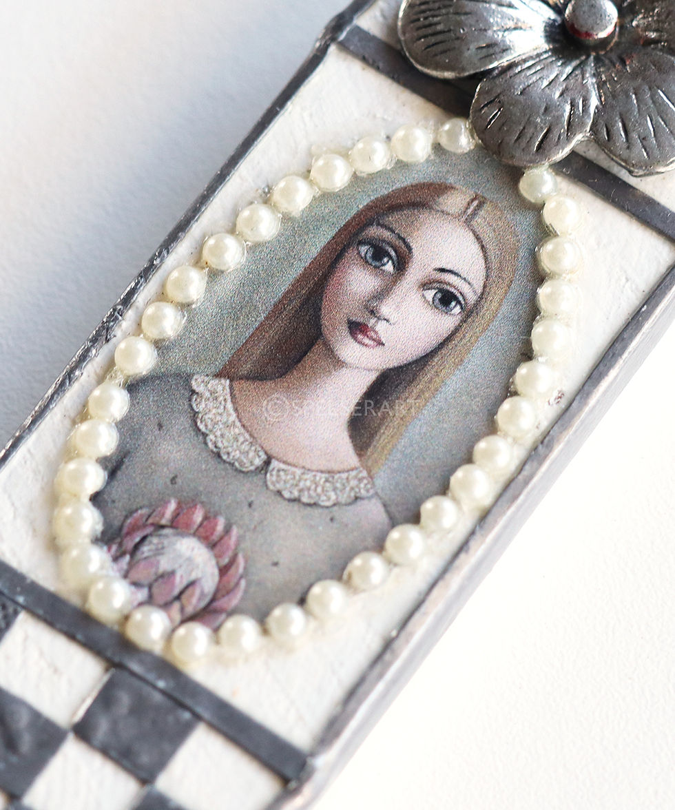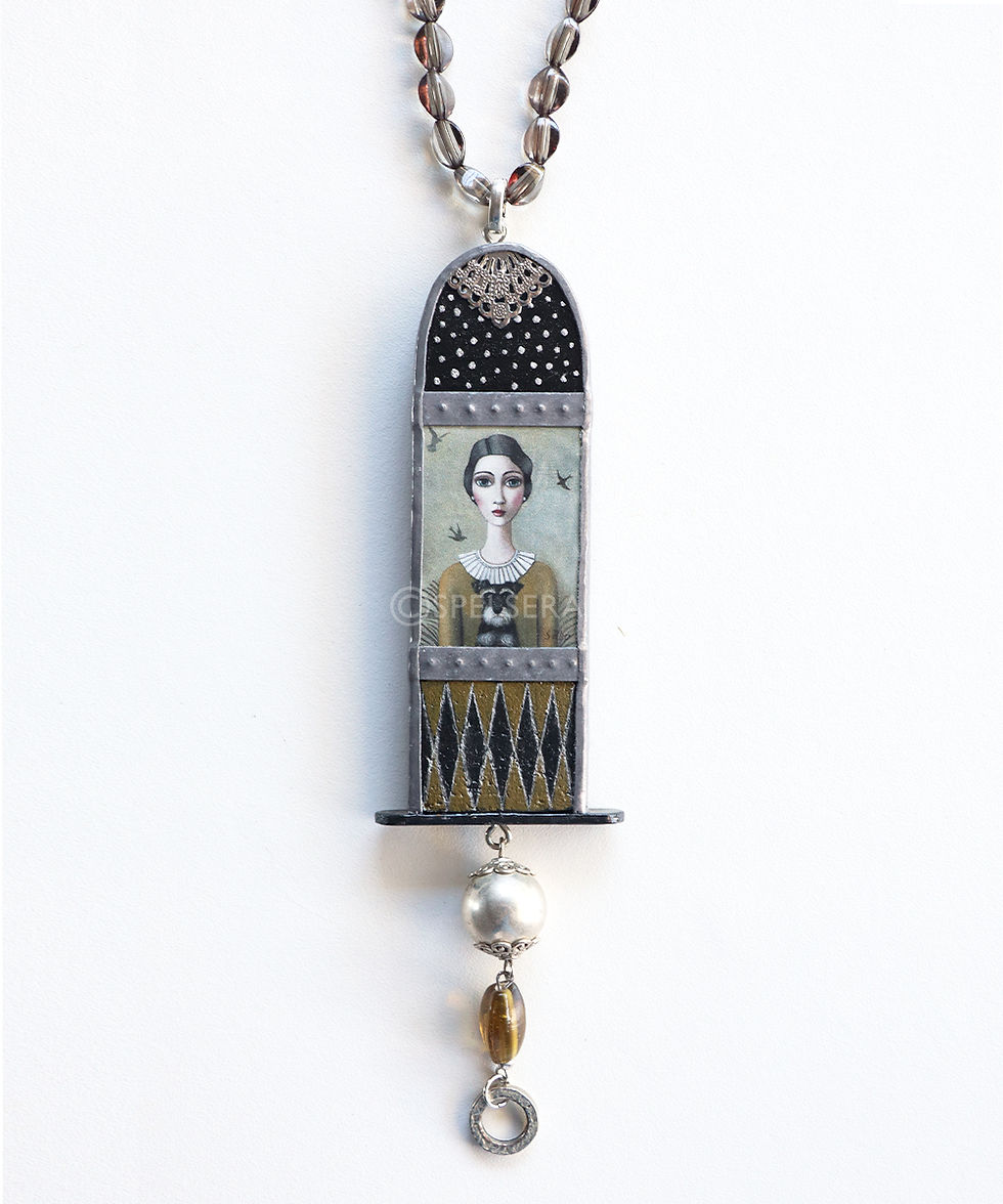 Discover our unique, handmade charms. They have a wooden base and contain a small printed image of one of Sandra’s ladies. The charms measure ± 110 x 35 x 10mm, and have varying chain lengths. They can be worn around the neck, hung on the wall or draped over a bodice or vanity.