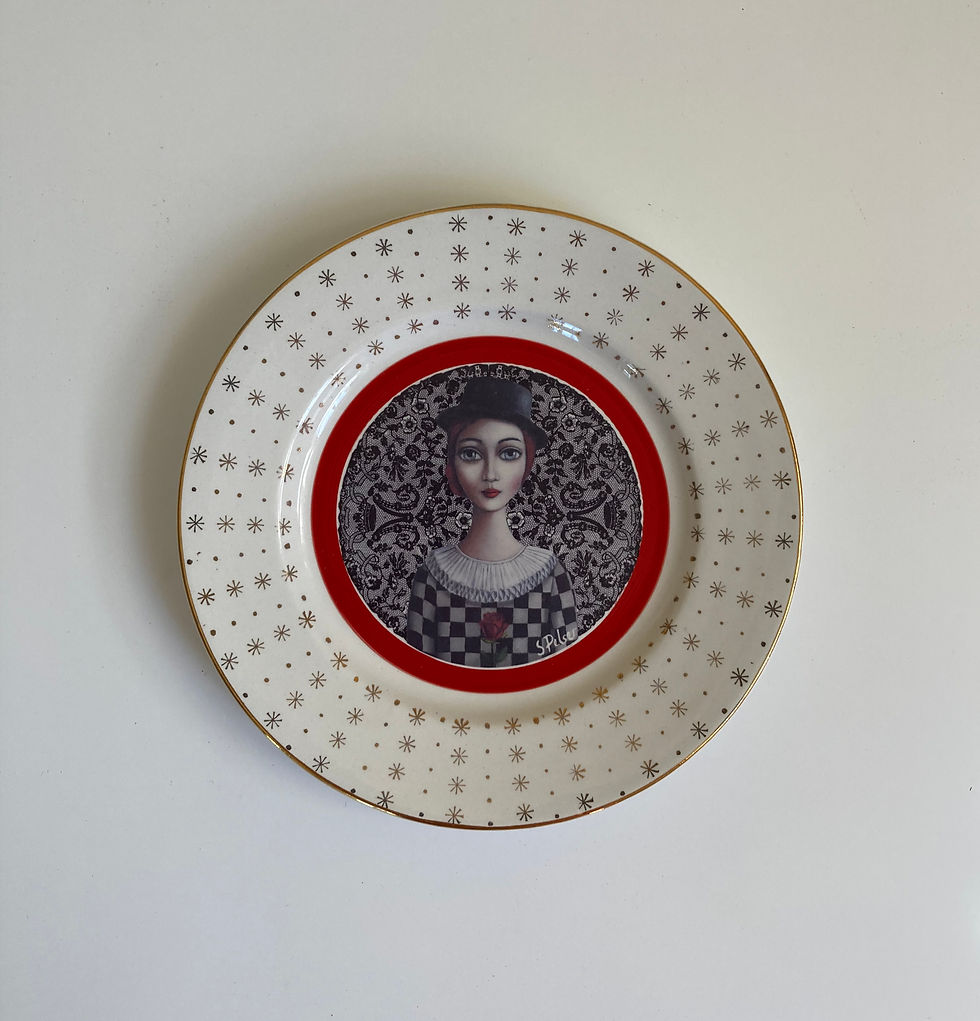 Our decorative wall plates come in various sizes. They are crafted from vintage and repurposed plates, each with its own distinct character. They feature a Sandra Pelser print that compliments the plate’s unique features. Each plate has a hook at the back for easy hanging.
